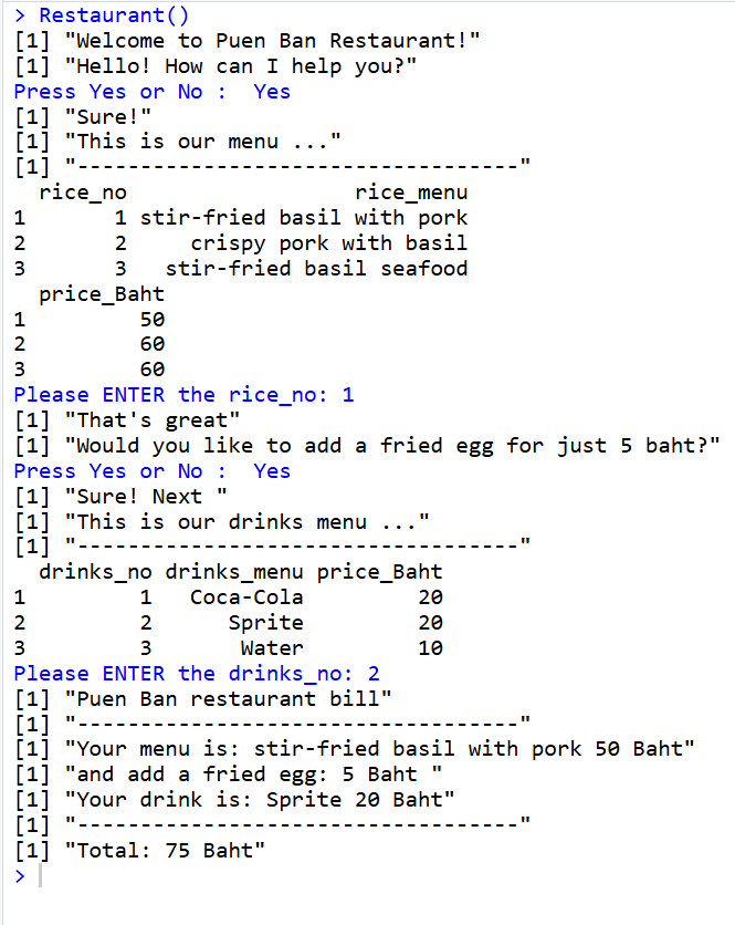 Project – Puen Ban Restaurant (Chat bot) สร้างแชท bot / เมนูอาหาร / เมนูน้ำ / ท็อปปิ้ง(ไข่ดาว) / ใบเสร็จ